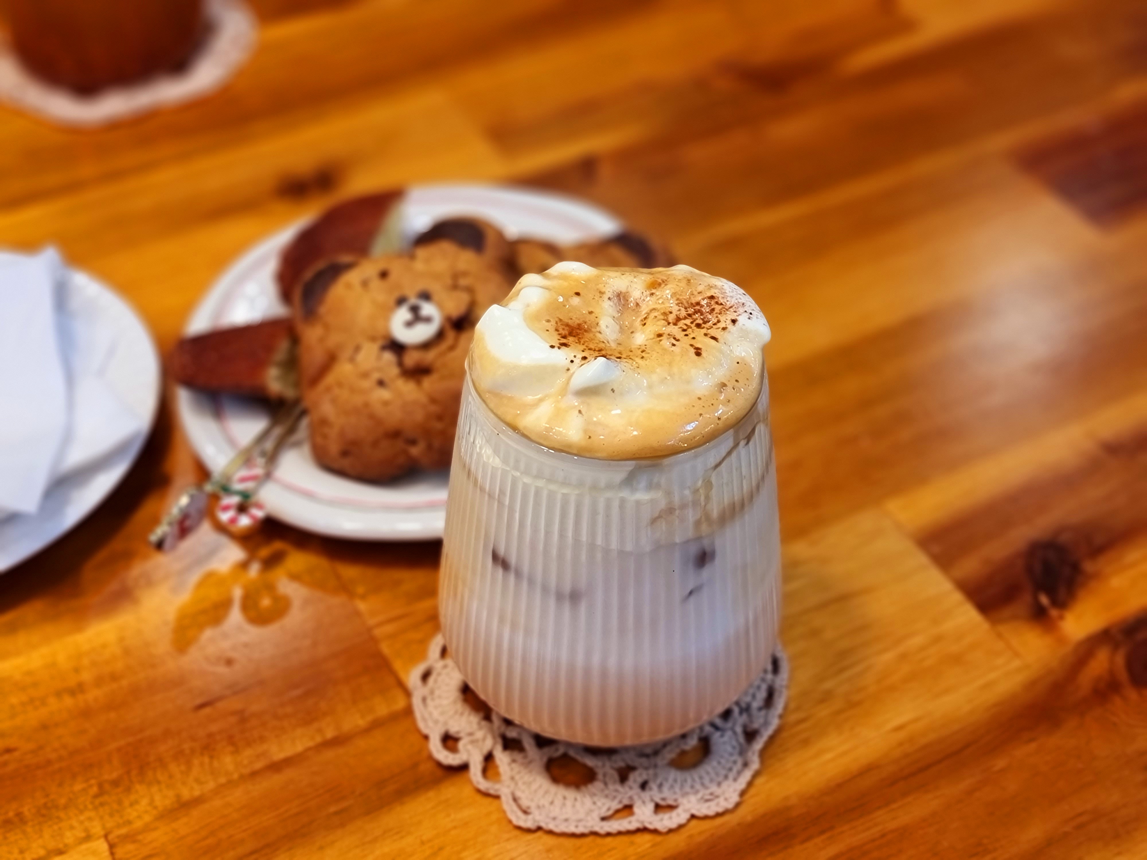 크림라떼와 곰돌이 쿠키를 시켜봤어요.